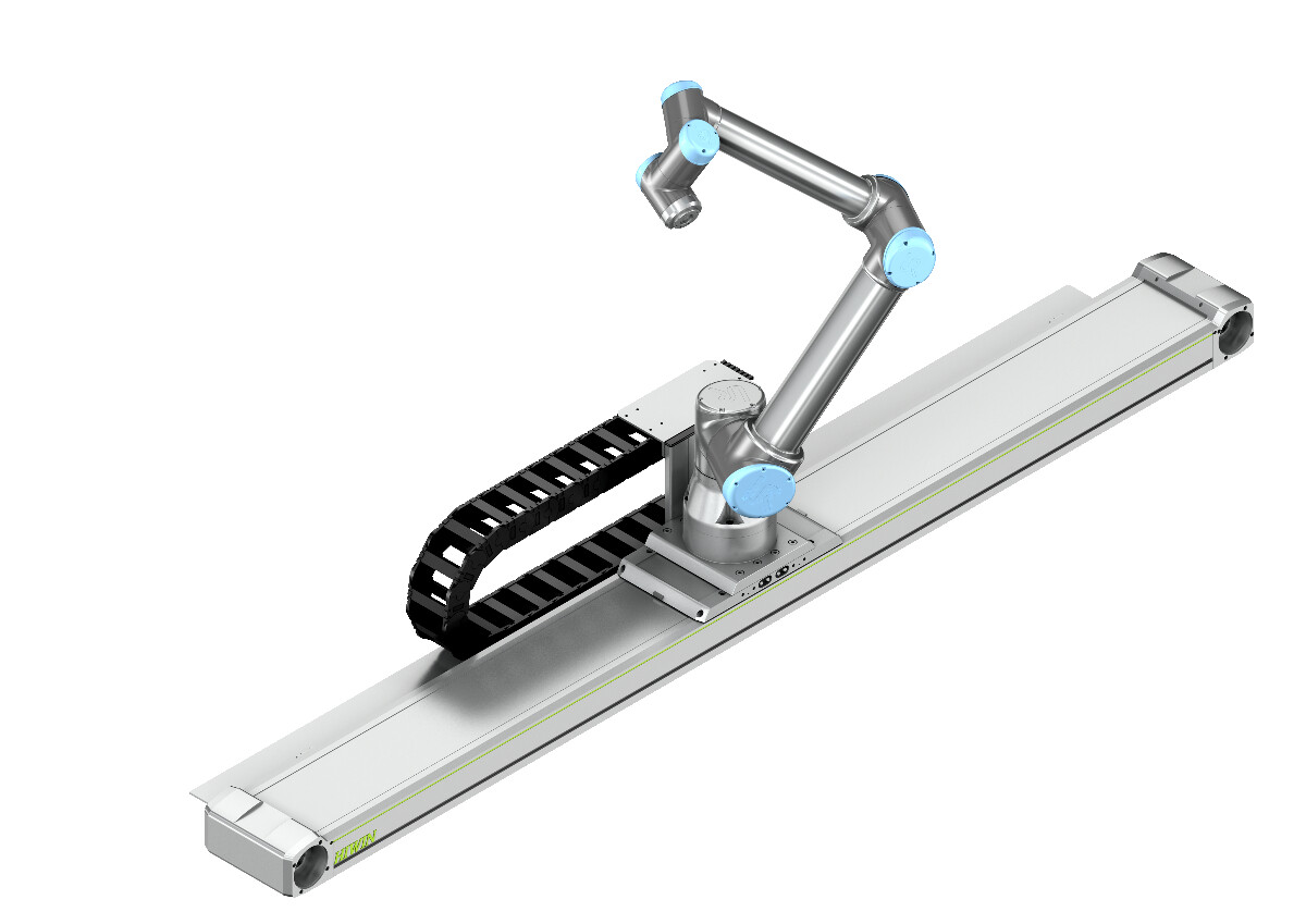 HIWIN linear tables are available with belt and shaft end drives. Thanks to a freely selectable stroke in millimetre steps and a wide range of options (e.g. steel cover strip, limit switch, energy chain, motor adaptation), the axes can be individually adapted to the respective application requirements. All 7th axes for UR are supplied including robot adapters for the UR3e, UR5e, UR10e or UR16e. The plus for every UR robot. The robot axes are optimised for horizontal use. Axes for vertical applications on request.