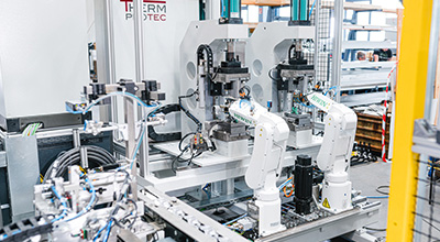 In this context, ThermProTEC has been increasingly implementing robots in its equipment for some years now in order to feed or withdraw heavy components. When it comes to the stabiliser production equipment, numerous robots also come into play. Robots from HIWIN have been involved in this from the very start.
